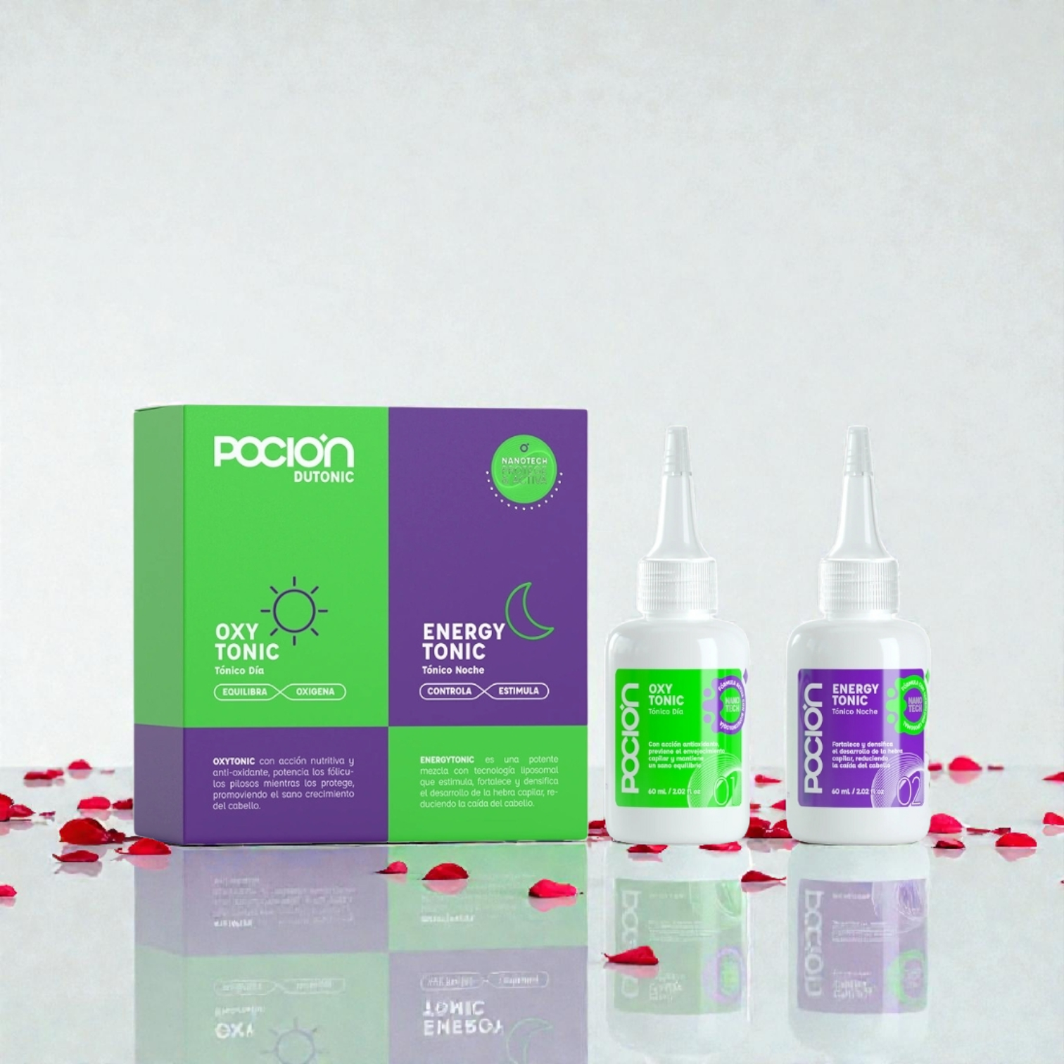Contiene OXYTONIC para aplicar al iniciar tu rutina diurna y ENERGYTONIC en tu rutina nocturna.