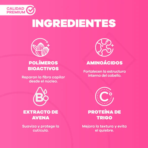 Fortalece el cabello para resistir el quiebre, protegiéndolo de los agresores ambientales y defendiendo el cabello de los daños causados por el cepillado y/o altas decoloraciones.